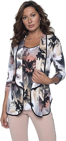 Frank Lyman Style 191292. Jacket with 3/4 length sleeves, black trim and a floral pattern. Shown with matching tank style 191291 (sold separately)