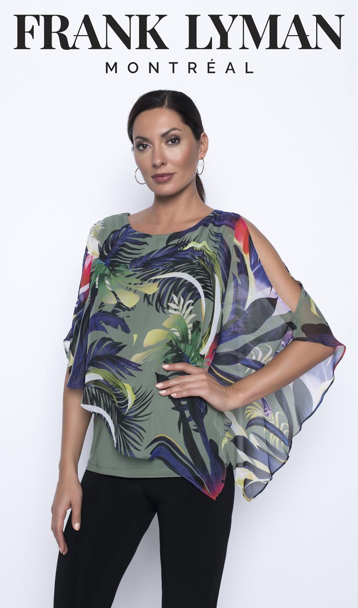 Frank Lyman Style 196646. Tropical detailed top with attached A-symmetrical overlay/cape with high back, scoop neckline and peekaboo arms.