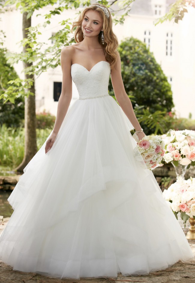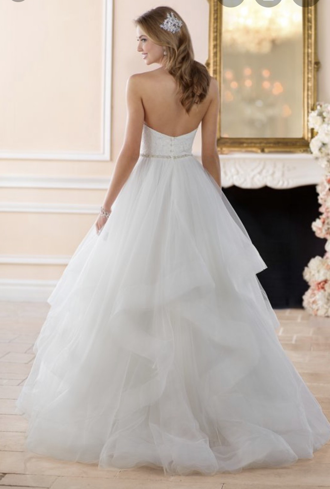 Style 6315, Layered ball gown wedding dress from Stella York is a princess bride’s dream come true! Layers of tulle create volume through asymmetrical horsehair hemlines. A lace covered bodice with a strapless sweetheart neckline is reminiscent of traditional ball gowns but this wedding gown is given an update with a Diamante belt that shimmers at the waist.
