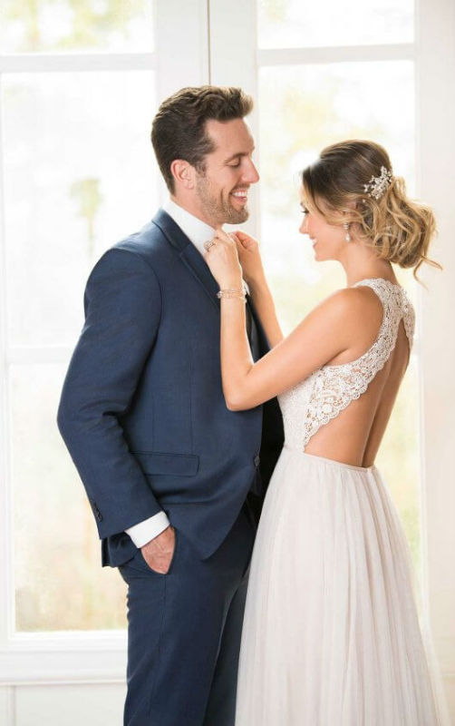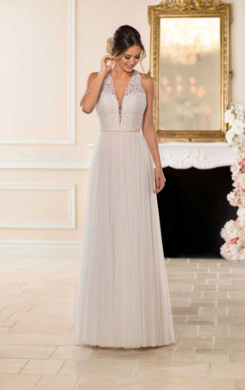 Stella York Style 6707. With a completely open back and a total Boho vibe, this designer wedding dress by Stella York is a knockout! Lace and French tulle over matte side lavish satin come together to create a beautiful wedding dress. The cotton-style lace lends itself to the easy-to-wear vibes of this dress with a deep V-neckline and halter-inspired straps. A kissing scallop detail has been added to the neckline as a sweet and delicate detail. The tulle skirt has a short train that makes dancing the night away a breeze!
