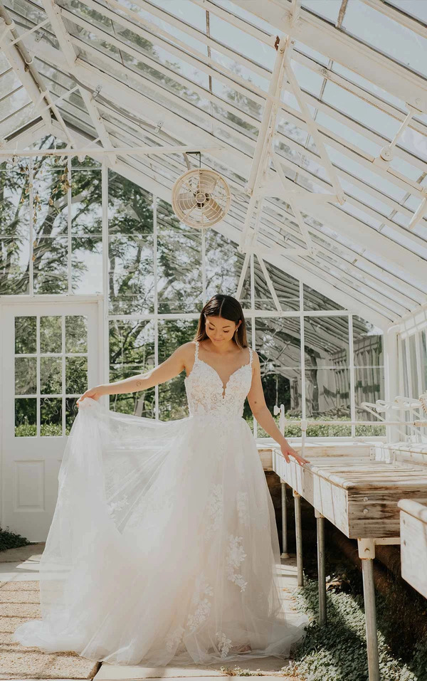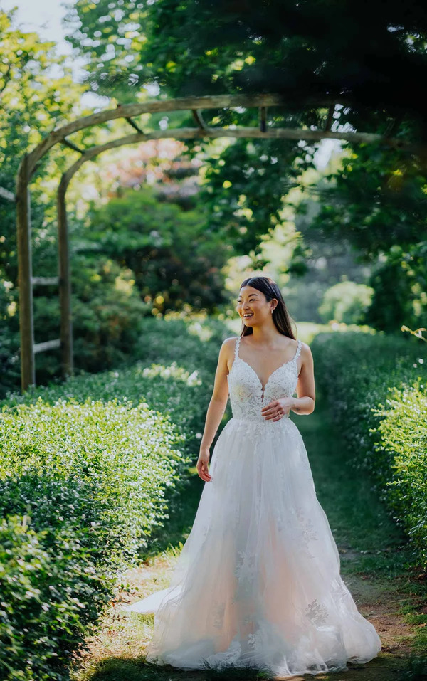 An ethereal vision of delicate lace and airy tulle, Style 7492 is the epitome of sophisticated bridal style. From the organic lace straps to the sculpted bodice and sexy plunging neckline, this flattering A-line wedding dress is a celebration of everlasting romance. The allover floral lace bodice drapes into the layered tulle skirt for an elegant gracefulness that effortlessly floats down the aisle with a full and soft sweeping train. This wedding gown is also available in plus sizes.