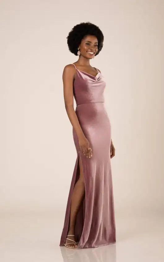 Sorella Vita modern floor-length velvet Special Occasion/Mom/Prom/Bridesmaids Dress featuring a cowl neckline and spaghetti straps.