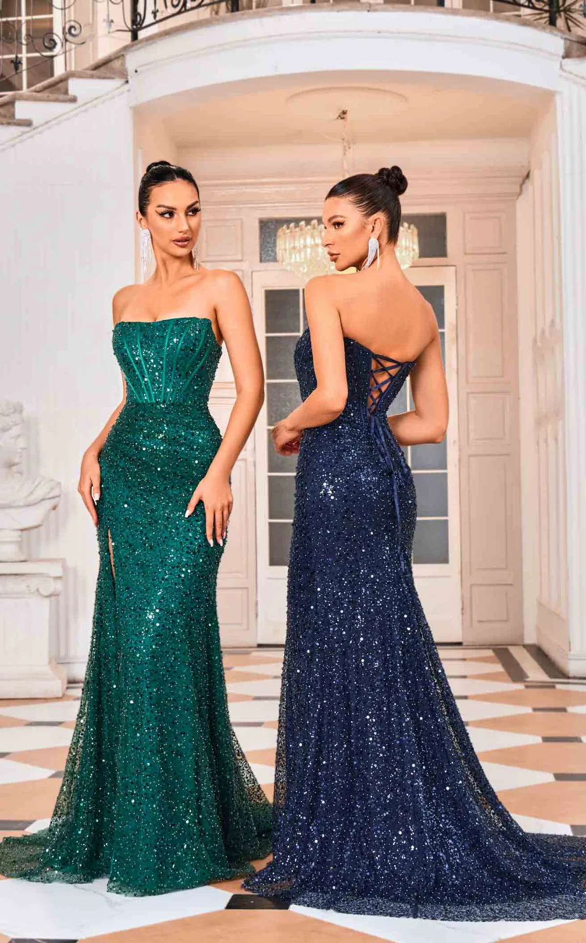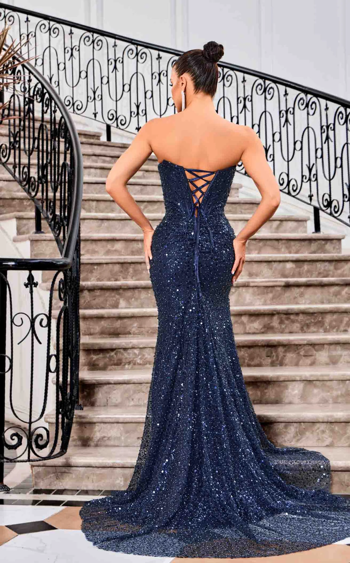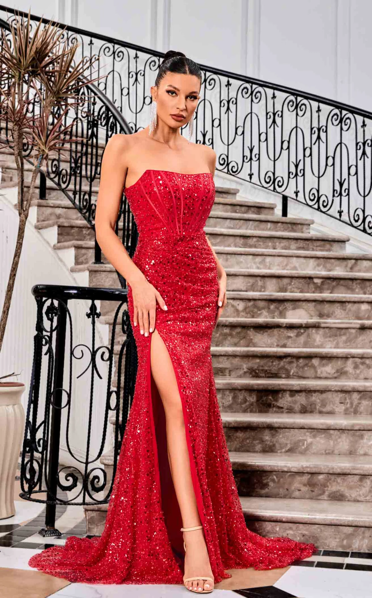 Jadore Style J24021. This full length dress features a straight-across neckline and a tie-up back. The silhouette is adorned with intricate beads and sequins with visible boning on the bodice and soft ruching/gathering for a flattering shape. The high-slit skirt adds to an enticing look.