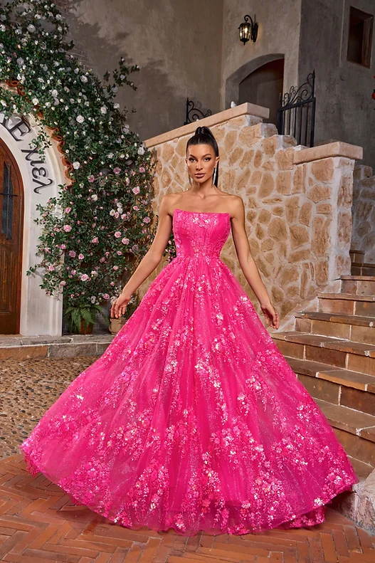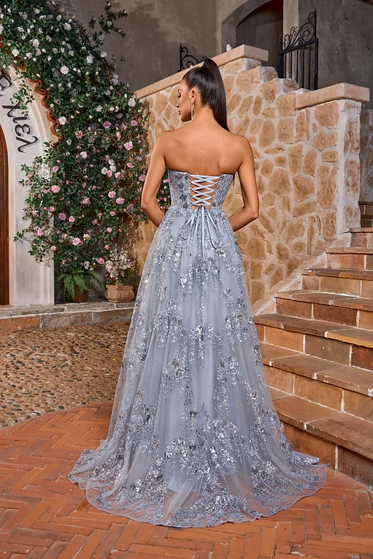 Jadore Style J26039. You asked for sparkle, well here it is! This stunning A-line dress features floral embroidery detail accented with sequins overtop of a full layer of shimmer tulle. Strapless soft scoop modern neckline with visible boning, open tie-up back, and pockets! Perfect for prom or other special event where you want to shine.