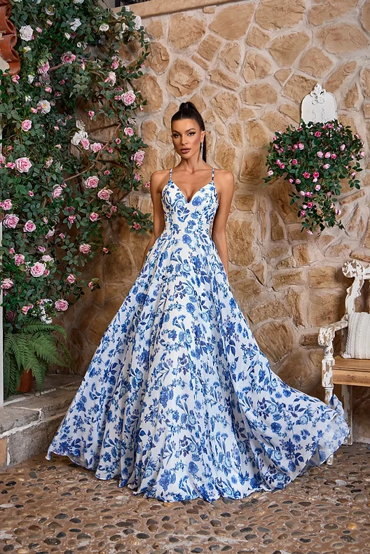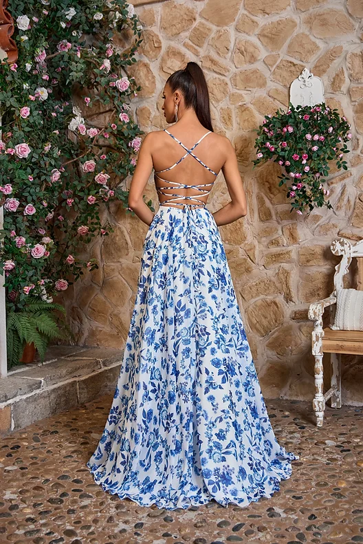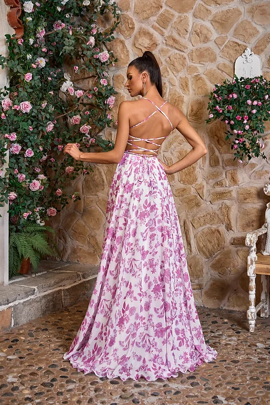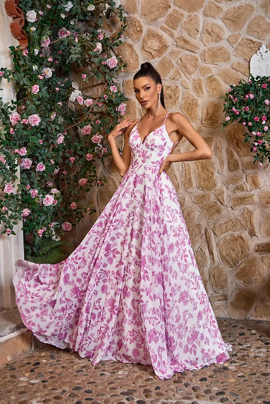 Jadore Style J26044. Long flowy chiffon dress with pockets and a beautiful floral print. Banded waistline, spaghetti straps that carry over to the open tie up back, finished off with a sweeping train.